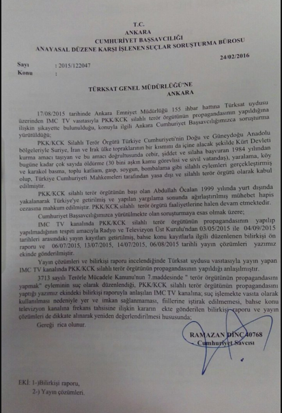 Անկարայի հանրապետական դատախազության՝ Սահմանադրական կարգի խախտմանն ուղղված հանցանքների քննության բյուրոն պահանջել է, որ İMC TV-ն դուրս բերվի «Թյուրքսաթ»-ի արբանյակից՝ «PKK/KCK (Քրդական աշխատավորական կուսակցություն/Քրդստանի համայնքների միություն) պրոպագանդայի» պատճառաբանությամբ։