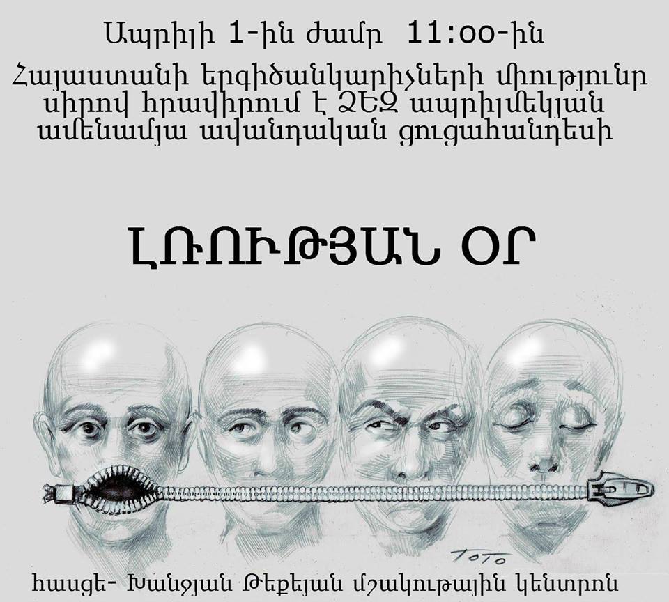 Ապրիլի 1-ն էր, շաբաթ օր. Ծիծաղի օր էր, նաեւ խաբելու օր։ Հայաստանի երգիծանկարիչների միութիւնը հրաւիրել էր ապրիլմէկեան ամենամեայ աւանդական ցուցահանդէսի առաւօտեան ժամը 11-ին։ Ցուցահանդէսի բացմանը ես ուշացայ եւ եկայ ժամը 13-ին։ Դուռն արդէն գոց էր եւ ինձ ասացին, որ վերեւը մարդ չկայ եւ նայելու բան էլ չկայ, որովհետեւ նկարները դատարկ են։ Խաբելու օր է, դէ նկարիչներն էլ խաբեցին։ Ես չգիտեմ, ինչպէս իրենք մեկնաբանեցին իրենց մտայղացումը, սակայն երբ ես բարձրացայ եւ տեսայ 15 նկարիչների կողմից ստորագրած 45 դատարկ պաստառներ, ապա ամէն ինչ հասկացայ։ Անցեալ տարի Ապրիլի 1-ին բացուեց երգիծանկարիչների ցուցահանդէսը «Մամուլ» թեմայով, որն ընդհատուեց Ապրիլի 2-ի ողբերգութեամբ։ Եւ այժմ նկարիչները յարգեցին մեր հերոս զինուորների մահը լռութեան ցուցահանդէսով։ Աւելի ուշ կարդացի Երգիծանկարիչների միութեան նախագահ Սուքիաս Թորոսեանի մեկնաբանութիւնը. «Քանի որ Ապրիլի 1-ը համընկնել էր լռութեան օրուայ հետ, մենք՝ յարգելով ՀՀ օրէնսդրութիւնը, սպիտակ պաստառներով ցուցադրուեցինք, իսկ ապագայ մեր օրէնսդիրները խախտեցին օրէնքը եւ չհանեցին փողոցներում տեղադրած նախընտրական գովազդները»։