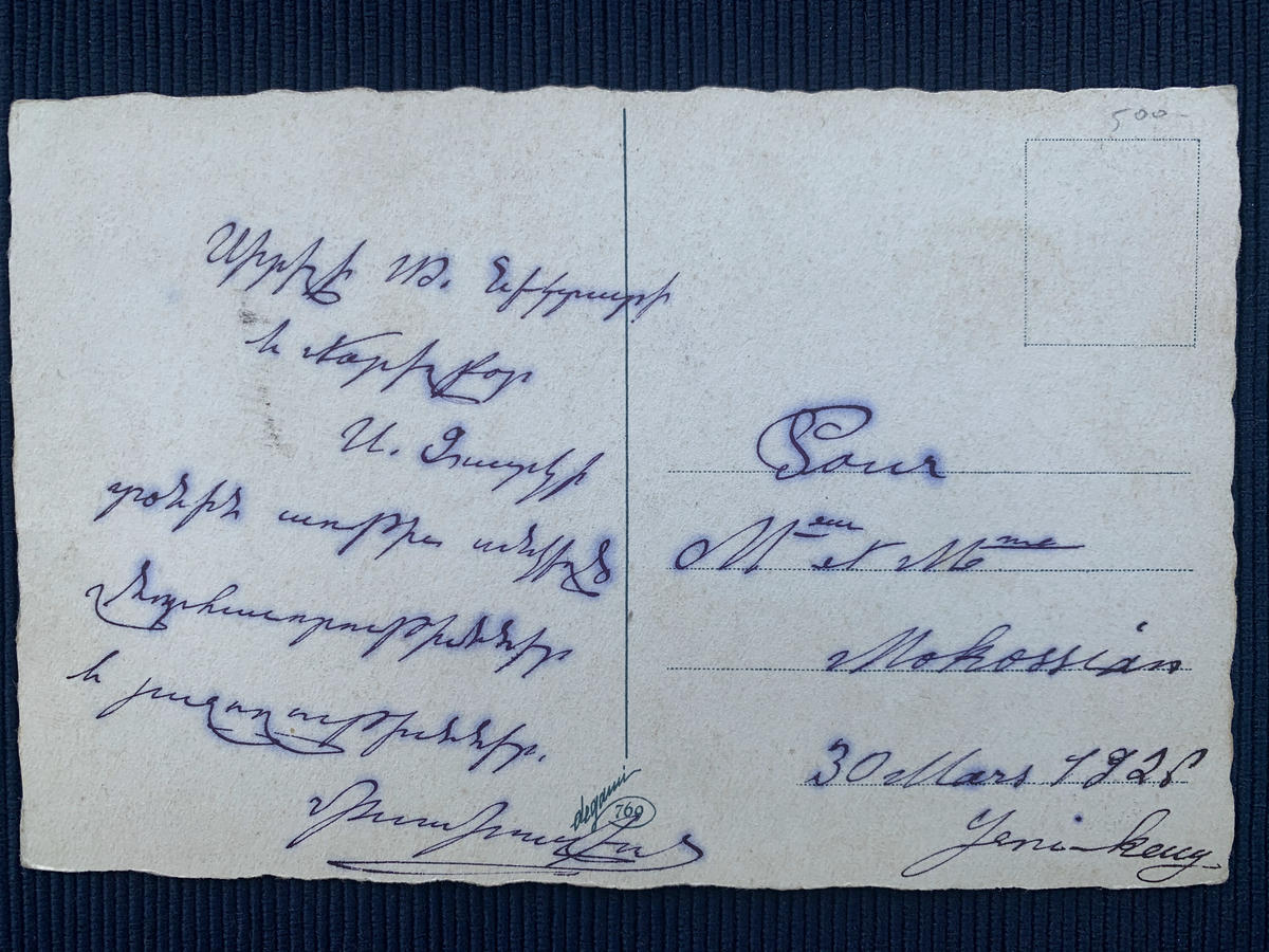 «Joyeuses Paques»՝ ահա թէ ի՛նչ է գրուած 1926-ի բացիկի դիմերեսի վրայ։ Հոն պատկերուած է երկար պարանէ կախուած սիրունիկ պատանի մը դեղձան, որ կը փորձէ խոշոր ոսկեգոյն զանգակ մը ղօղանջել։ Իսկ ցատկռտող ցնծուն գառնուկ մը կ՛աւետէ գարունը։ Բացիկի դարձերեսը ունի ընտիր ձեռագիր կապոյտ մելանով գրուած. «Սիրելի Տ. Ներկատի եւ մօրեղբօր Ս. Զատիկի տօնին առթիւ անկեղծ շնորհաւորութիւններ եւ յաջողութիւններ։ [Անընթեռնելի ստորագրութիւն]։ Pour M/eur et M/me Mokossian, 30 Mars 1926, Yenikeuy»։