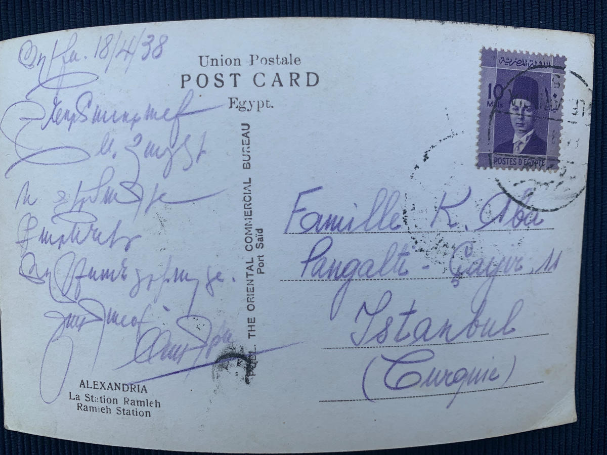 Վերջին բացիկը կը պատկանի 1938 թուականին, զոր Աղեքսանտրիայէն Պոլիս ուղարկեր է պր. Սագայեանը հետեւեալ խօսքերով. «Շնորհաւորանք Ս. Զատկի ու ջերմագին բարեւներ Աղեքսանտրիայէն։ Յարգանքով Սագայեան»։ Բացառիկ է պարոն Սագայեանի ձեռագիրը։ Հայկական գեղագրութեան լաւագոյն նմոյշներէն մէկն է ան։ Ունի ոլորուն եւ զարդարուն տառեր։ Բարձրաճաշակ է եւ նուրբ։ Բացիկը հասցէագրուած է հետեւեալ ձեւով. «Famille K. Aba, Pangalti, Cayir 11, Istanbul (Turquie)»