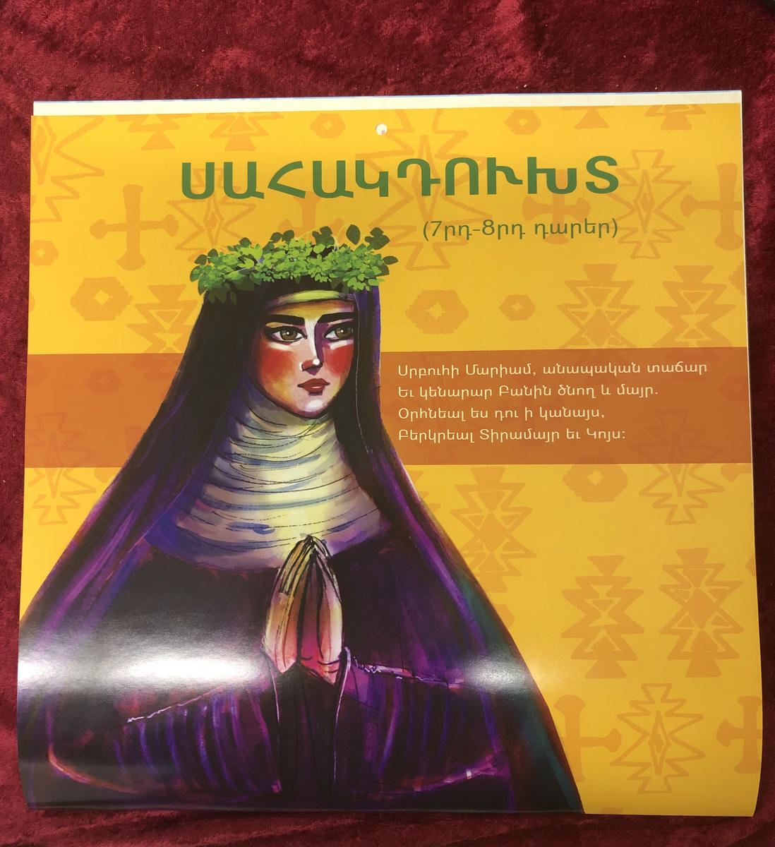 Երաժիշտ-բանաստեղծ Սահակադուխտը կը ներկայանայ գեղեցիկ դիմանկարով մը: Ան հագած է մանիշակագոյն տարազ եւ պսակուած է մշտադալար դափնիով մը: Գառնիի ձորի մէջ կուսական կեանք վարած այս հայուհին հմտացած էր երաժտութեան եւ բանաստեղծութեան մէջ, ունէր աշակերտներ, կ՛ուսուցանէր վարագոյրի ետեւ նստած: Հոգեւոր երգեր, կցուրդներ եւ «քաղցրաեղանակ» մեղեդիներ յօրինած Սահակիդուխտը օրացոյցի վրայ կը ներկայանայ մեզի ծանօթ իր միակ ստեղծագործութեամբ՝ Աստուածամօր ձօնուած երգի առաջին քառեակով.