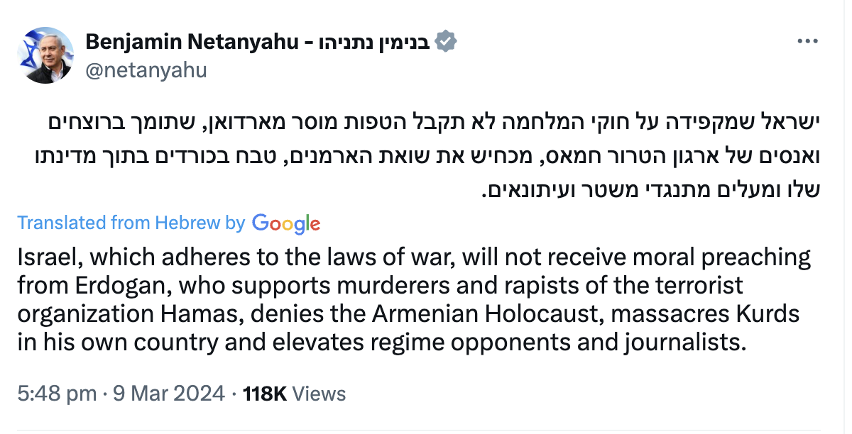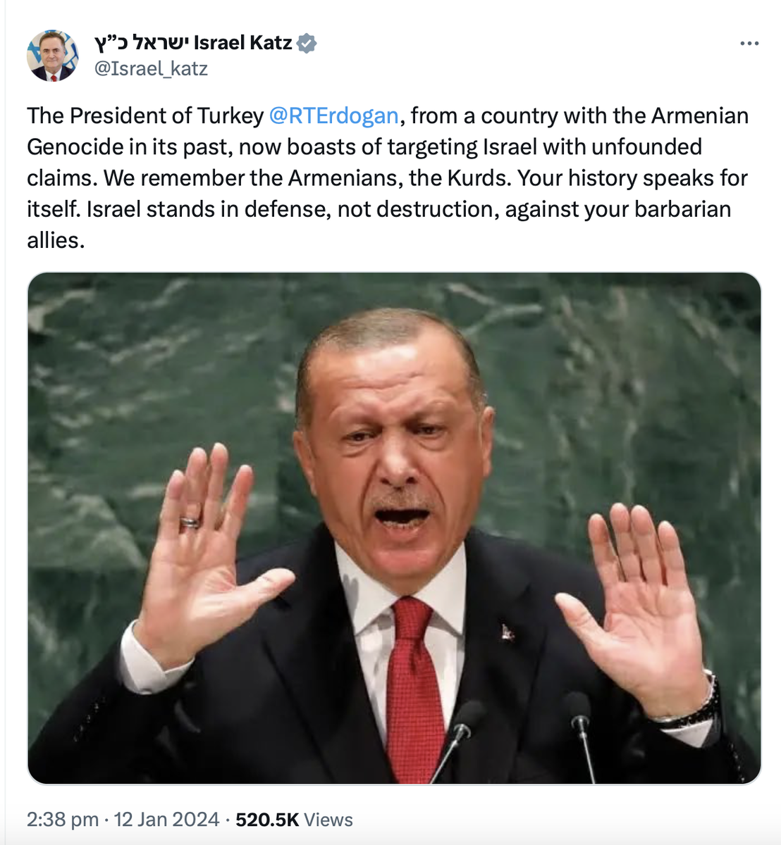 The curious part in Netanyahu’s tweet was his reference to the “Armenian Holocaust”. A similar tweet came from Israel's Minister of Foreign Affairs Israel Katz on January 12, 2024: “The President of Turkey @RTErdogan, from a country with the Armenian Genocide in its past, now boasts of targeting Israel with unfounded claims. We remember the Armenians, the Kurds. Your history speaks for itself…”