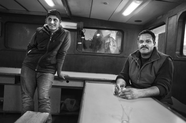 Gemilerde çalışanlar sadece balıkçılar değil, mesela Silifkeli Hasan 15 senedir su üstünde. Eskiden Mersin’de ciğercilik yapıyormuş, şimdi geminin aşçısı. Oğlu Fatih de ona yardım ediyor, on numara çay demliyor. Biz sohbet ederken geminin kaptanı yanaşıyor yamacımıza, 12 ülke gezdim diyor, “Bir fark yok. İnsan her yerde insan, balıkçı da her yerde aynı…”
