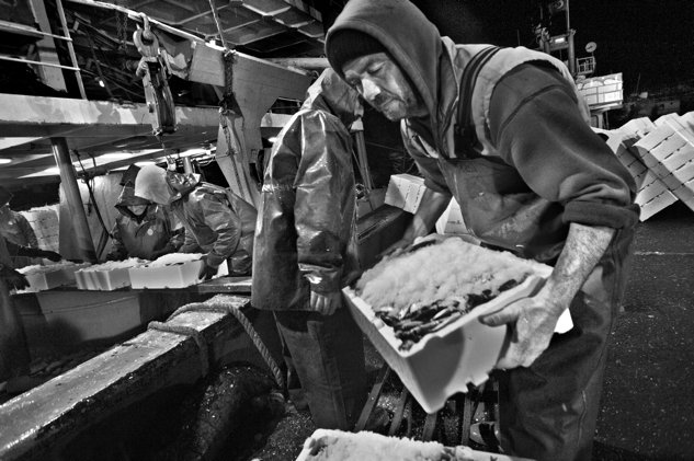 Yakalanan balıklar kasalara dolduruluyor ve diğer yandan buz makinası da harıl harıl çalışıyor. Deposu dolu motor kıyıya yanaşmış ve artık son bir gayret kasalar teslim edilecek, ardından yorgun balıkçılar dinlenmeye çekilecek.