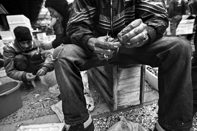 Ekmek peşinde işe koyulanların halde yaptıkları ilk iş getir götür esnasında etrafa dağılan artık balıkları toplamak. Ellerinle torbalarla gezip sağlam kalan balıkları buluyorlar.
