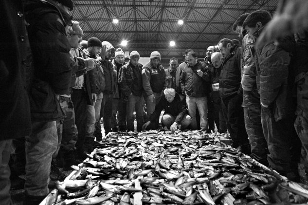Haldeki açık artırmalardan biri… Bir kasa balık için önceden belirtilen bir fiyat var. Eğer bu fiyatı beğenen çıkmazsa taliplerden fiyat alma aşamasına geçiliyor. Verilen rakamı komisyoncu kabul ederse yandaki muhasebeci hemen alışverişi kayda geçiriyor.