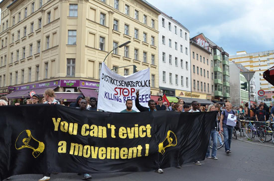 Almanya’nın başkenti Berlin’de 40 kadar mültecinin, yaşadıkları binanın boşaltılmak istenmesine karşı çatıda sürdürdükleri direniş devam ederken, yaklaşık 5 bin kişi direnişe destek vermek amacıyla yürüyüş düzenledi.