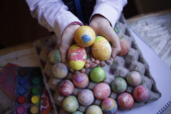 Bembeyaz yumurtalar, bembeyaz kağıtlar da renklenince iyice bayram havasına bürünüyor ortalık. Dışarıda mis gibi bir bahar havası, cıvıl cıvıl çocuk sesleri derken, biz bayramı getiriyoruz bile…