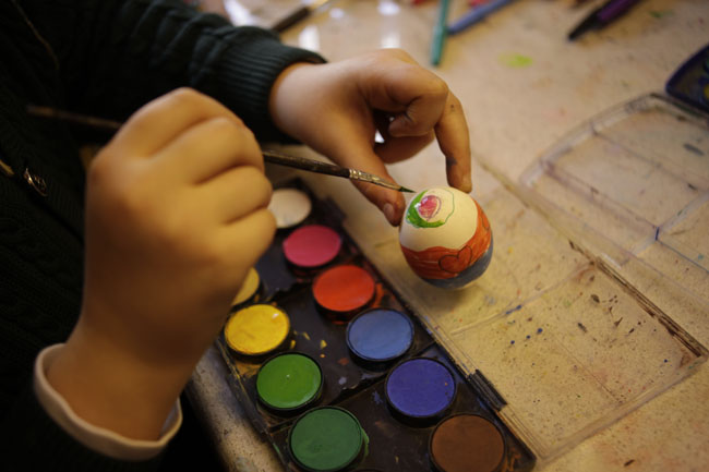 Çocuklar cıvıl cıvıl, enerji dolu. Atölyedeki öğretmen masasında, bir karton haşlanmış yumurta duruyor. Çocuklar bizim Agos’tan geldiğimizi, fotoğraflarını çekeceğimizi öğrenince daha da mutlu oluyorlar. İçlerinden biri arkadaşlarına, “Duyduk duymadık demeyin bu sınıf ünlü oluyor!” diye bağırıyor. Hepsinin önlerinde birer suluboya seti var. Tek tek yumurtaları alıyorlar. Öğretmenleri, “İstediğiniz motifi yapmakta özgürsünüz” diyor. Kimi kalp çiziyor, kimi şeritler.