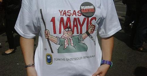 Türkiye Gazeteciler Sendikası kortejine tişörtlerinde '1 Mayıs Pankartı'nı tutan' Latif Demirci'nin çizgi karakteri Güllü Hanım çizimi bulanan katılımcılar renk kattı.