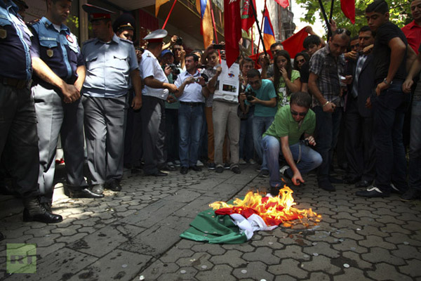 Macaristan Büyükelçiliği göstericiler tarafından domates yağmuruna tutuldu, elçilikteki Macaristan bayrağı indirilerek yakıldı.