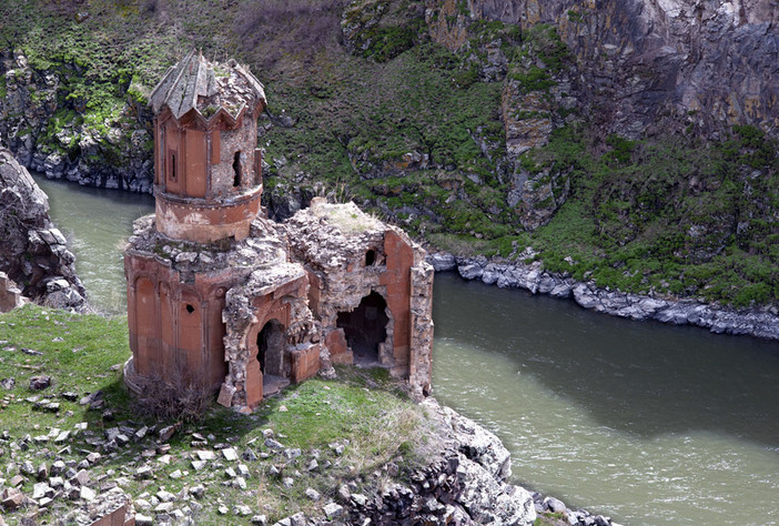 Hripsimiyan Bakireleri Manastırı'nın 1000 ile 1200 arası bir tarihte inşa edildiği sanılıyor. Manastırın yanından akan Akhuryan nehri, Ermenistan-Türkiye arasında doğal sınır teşkil ediyor. (Fotoğraf: Georgios Giannapoulos)