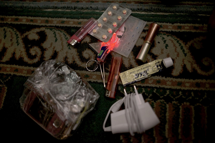 Khadra Khamess’in ailesi, kontrol noktalarını atlatmak için bir ay boyunca yürüyerek Şam’dan Türkiye sınırına varmış. Kocası ve bir oğlu Suriye’de öldürülmüş. Khadra, kocasının telefonunu ve ufak tefek eşyalarını çantasında taşıyor.