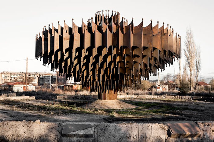 Arthur Tarkhanyan tarafından tasarlanan ve Gümrü Politeknik Üniversitesi bahçesi içinde duran demir şelale, 1982, Gümrü, Ermenistan. 1988'deki deprem şehrin büyük bir kısmını yok etti fakat bu anıt hala yerinde duruyor.