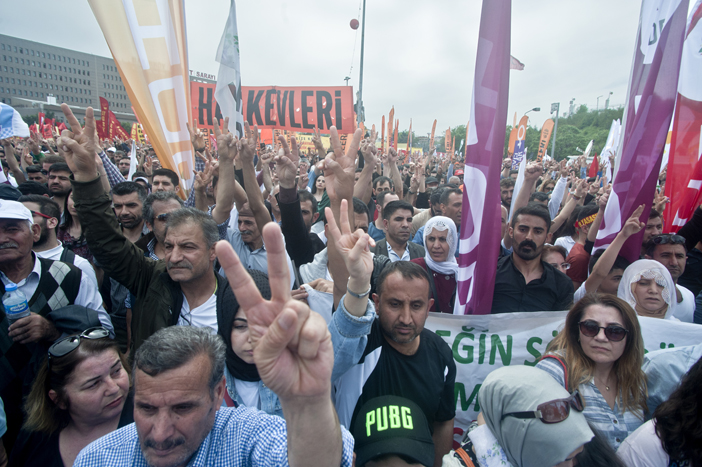 Diyarbakır’da 1 Mayıs kutlaması için İstasyon Meydanı’nı dolduranlar, tecride karşı süren açlık grevleri ve başlatılan ölüm orucuna konusunda devlet ve hükümetten yasalara uyulmasını istedi. Ölüm oruçları nedeniyle seferberlik çağrısı yapan beyaz tülbentli annelerin, Koşuyolu Parkı’na doğru düzenledikleri yürüyüş ise polislerce engellendi. (Fotoğraflar: Berge Arabian)