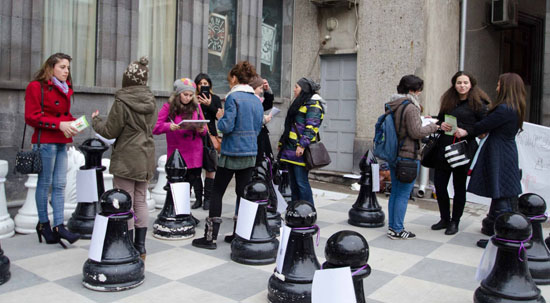 Geçen haftalarda, Yerevan'ın merkezinde bulunan Moskova Sineması’nın önündeki devasa satranç tahtasında düzenlenen bir atölyede, satranç taşlarının üzerine çeşitli taciz şekilleri yazılmış ve insanlara bu taciz türlerinden biriyle karşılaştıklarında nasıl tepki verecekleri, ne yapmak istedikleri ve neleri yapamadıkları sorulmuş. Sorulara yanıt verenlerin yaş ve cinsiyetine göre bir analiz yapılıp, sokak tacizine karşı verilen tepkilerin bir profili çıkarılacak. Yine sokak taciziyle ilgili ‘Mi Lrir’ (Sessiz Kalma) isimli başka bir çalışma için hazırlanan haritadaysa, kadınlar, sokak tacizine uğradıkları yeri haritada işaretleyip, ayrıntıları aktararak deneyimlerini paylaşıyorlar.
