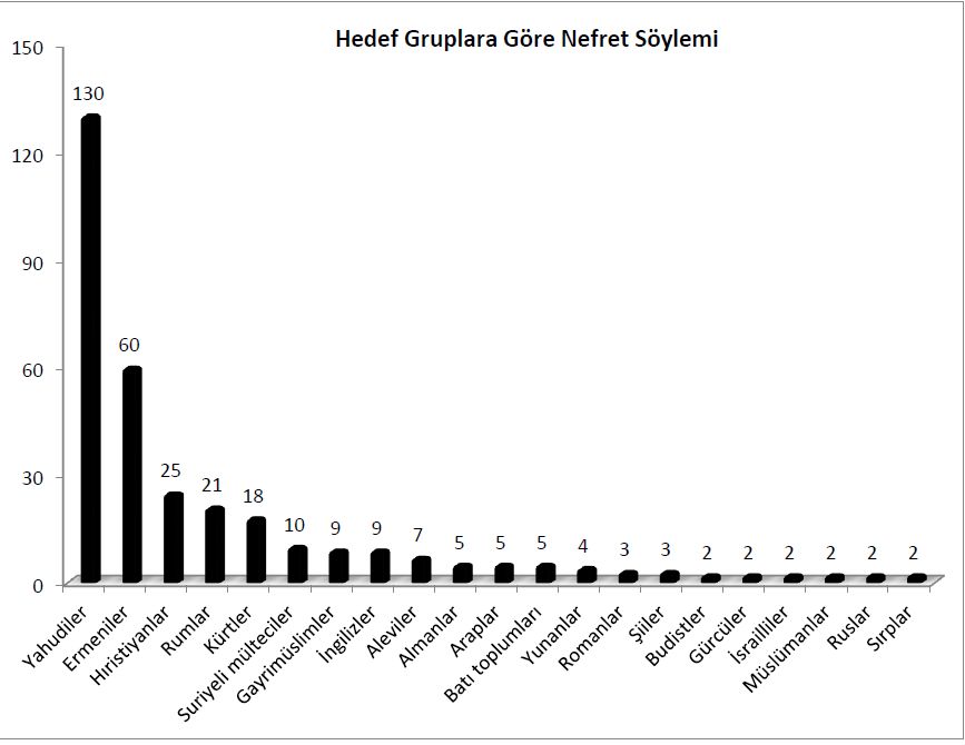 Araştırma kapsamındaki dönem içinde 32 farklı grup nefret söyleminin hedefi oldu. Bir önceki dönemde bu sayı 21’di. Nefret söylemine maruz kalan gruplar arasında Yahudiler ve Ermeniler listenin başında. Suriyeli mülteciler, İngilizler, Almanlar, Romanlar, Gürcüler, Budistler, Sırplar ve Ruslar da nefret söyleminin hedefi haline gelen gruplar arasında.