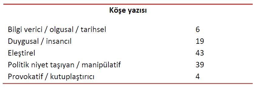 Aynı dönemde yayımlanan köşe yazılarından 39’u manipülatif, 4’ü ise kutuplaştırıcı ve provokatif. Hürriyet gazetesinden Akif Beki’nin 2 Temmuz 2014 tarihli yazısı da bu dört yazıdan biri.