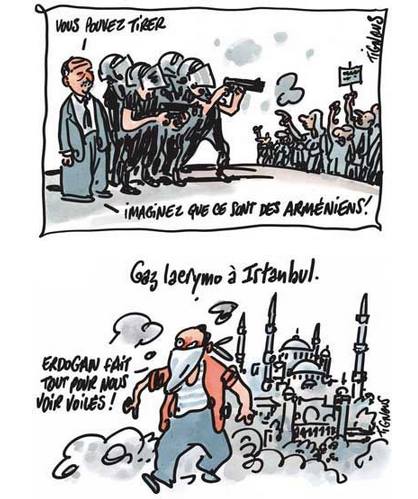 “Ermeni Soykırımı hakkındaki yasa: Türklerin misillemesi” başlıklı karikatürde, Erdoğan’ın ağzından “Kürtleri katletmek için artık silahlarımızı Fransa’dan almayacağız” deniliyordu.