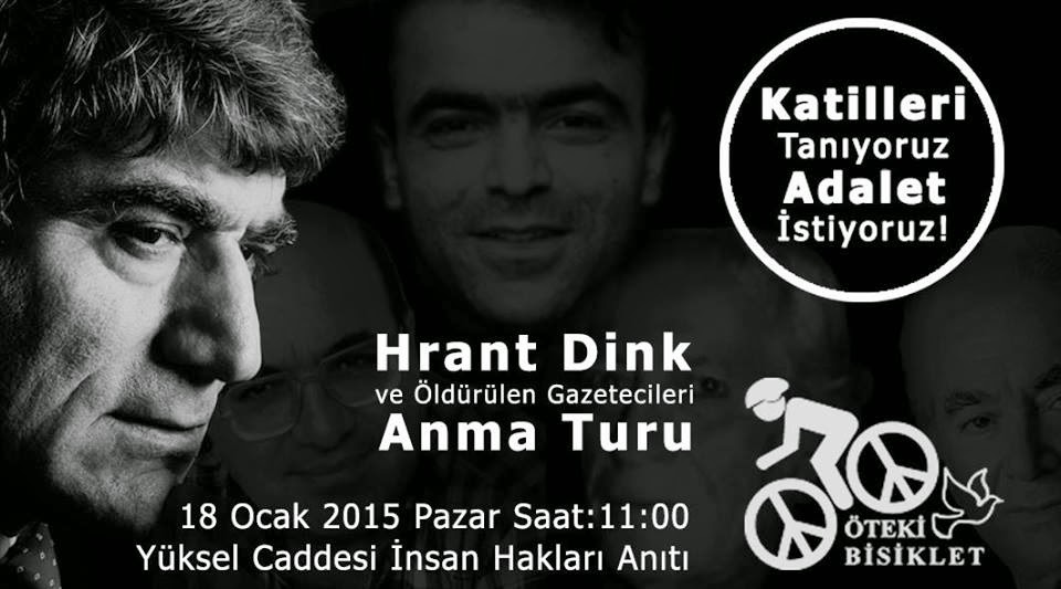 ‘Öteki Bisiklet’ inisiyatifi, Ankara’nın sokaklarını Hrant Dink nezdinde öldürülen gazetecileri anmak için pedallayacak. Güzergahta Uğur Mumcu'nun sokağı, Bahriye Üçok'un evi, Muammer Aksoy, Ahmet Taner Kışlalı'nın sokağı var. Musa Anter, Turan Dursun, Metin Göktepe ve Çetin Emeç'le birlikte "buradayız ahparig" denecek.