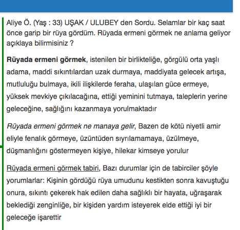 Bu sitelerden birinde Aliye Ö. şöyle yazmış: “Selamlar birkaç saat önce garip bir rüya gördüm. Rüyada Ermeni görmek ne anlama geliyor açıklayabilir misiniz?”