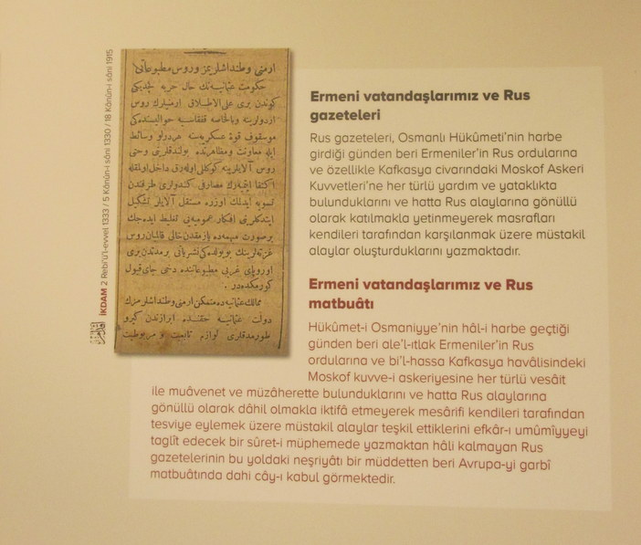 İstanbul Büyükşehir Belediyesi’nin hazırladığı “Havadis: Yüz Yıl Önce” sergisinde 1914 ve 1915 yıllarına ait gazete haberleri ve belgeler yer alıyor. Çanakkale Savaşı’nın ağırlıklı olduğu sergide Ermeniler “hain” iması ile anılırken, Rumlar da “asker kaçakları” olarak gösteriliyorlar. Her iki halkın yaşadığı katliamlardansa tek bir iz bile bulunmuyor.