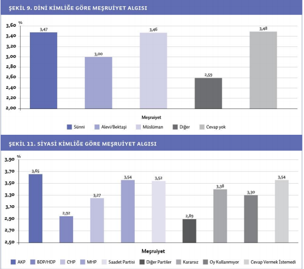 - Öte yandan, siyasi kimlik olarak kendini AKP seçmeni olarak tanımlayanlarda polise güven 3.76, CHP seçmenleri arasında 3.24, MHP seçmenleri arasında ise 3.55’ken BDP/HDP seçmenlerinin polise güvenme oranı 2.79