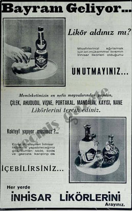 8 Şubat 1938 tarihli Akşam gazetesinde ‘Bayram geliyor...’ başlığıyla yer alan İnhisar Likörleri ilanı, ‘Likör aldınız mı?’ altbaşlığıyla ve “Misafirinizi ağırlamak için en nefis ikramın İnhisar likörleri olduğunu unutmayınız” cümlesiyle devam ediyor.