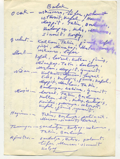 Sarkis Seropyan, Türkiye tiyatrosunun en önemli bayrak taşıyıcılarından, tiyatro dergisi Kulis’i 50 yıl boyunca tek başına çıkaran Hagop Ayvaz’ın, ölümünden sonra Agos’a verilen arşivinden, İstanbul’un mevsimlere göre balıkları tasnif ettiği notunu bulmuş. Herkese rehberlik etmesi dileğiyle, Lutsika Dudu’nun balık takviminin sizinle paylaşıyorum.