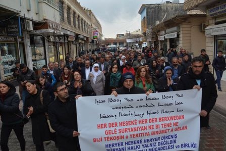 Mardin'in Midyat ilçesinde yaşayan Süryanilerce ilçede yapılan yürüyüşte grup açtıkları Kürtçe, Süryanice ve Türkçe "Her yer Hesekê, her yer direniş”