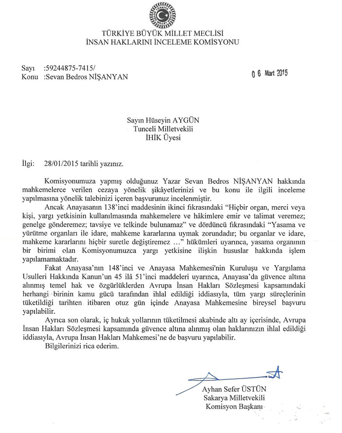 CHP Tunceli Milletvekili Hüseyin Aygün’ün Nişanyan’a verilen cezalarla ilgili olarak, İHİK’in konuyu incelemesi talebiyle yaptığı başvuruya Komisyon Başkanı Ayhan Sefer Üstün imzalı cevap verildi. Söz konusu yazıda, Komisyon’un yargı yetkisine ilişkin hususlara hakkında işlem yapılamayacağını belirtildi. Komisyon’dan gelen cevapta, ‘Anayasa’da güvence altına alınmış temel hak ve özgürlüklerden herhangi birinin kamu gücü tarafından ihlal edildiği iddiasıyla Anayasa Mahkemesi’ne bireysel başvuru yapılabilir” ifadesi yer aldı. Komisyon, iç hukuk yollarının tüketilmesinin ardından Nişanyan’ın Avrupa İnsan Hakları Mahkemesi’ne başvurulabileceğini de belirtti.