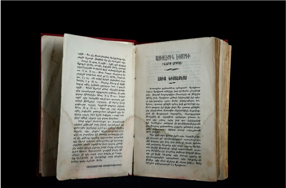 Türkçe konuşan fakat Ermenice harfleri tanıyanlar için özellikle yazılan Ermenice harfli Türkçe Yeni Ahit. Kitap ailesiyle beraber, 1915’te Adana’dan Lübnan’a kaçan Ağavni Hanım’a ait. Ağavni kitabı kızı Öjen Asaduryan’a bırakmış, Öjen de kızı Sırpuhi’ye. Yıllarca ailede muhafaza edilen ve kullanılan bu kitabı Sırpuhi 2002’de Ermenistan’a getirmiş.