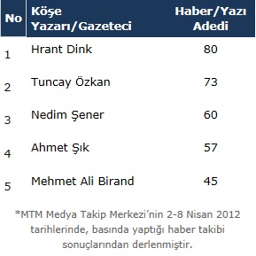 2-8 Nisan haftasında basının en çok ilgisini çeken isimler, 2007'de suikaste kurban giden Agos Gazetesi Genel Yayın Yönetmeni Hrant Dink ile Ergenekon üyeliği suçlamasıyla Silivri Cezaevi'nde bulunan Tuncay Özkan oldu. Hrant Dink hakkında basında 80 haber yer alırken, Tuncay Özkan ile ilgili olarak da 73 haberin yayınlandığı görüldü.