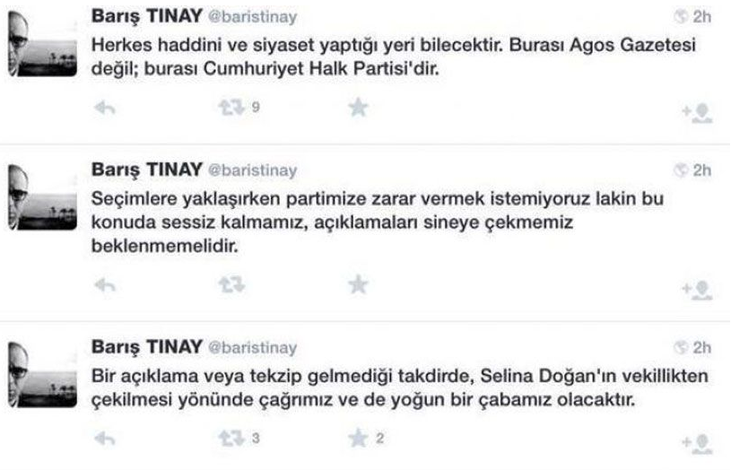 Tınay, resmi Twitter adresinden yaptığı açıklamada Doğan'ın adaylığına ilişkin açıklamada, AGOS gazetesini de hedef gösteren Tınay, "Selina Doğan'ın basına yansıyan soykırım sözleri ile ilgili açıklama yapması, bu sözleri kullanmadıysa da tekzip yayınlaması gerekmektedir. Bir açıklama veya tekzip gelmediği takdirde, Selina Doğan'ın vekillikten çekilmesi yönünde çağrımız ve de yoğun bir çabamız olacaktır. Seçimlere yaklaşırken partimize zarar vermek istemiyoruz. Lakin bu konuda sessiz kalmamız, açıklamaları sineye çekmemiz beklenmemelidir. Herkes haddini ve siyaset yaptığı yeri bilecektir. Burası AGOS gazetesi değil, Cumhuriyet Halk Partisi'dir" ifadelerini kullandı.