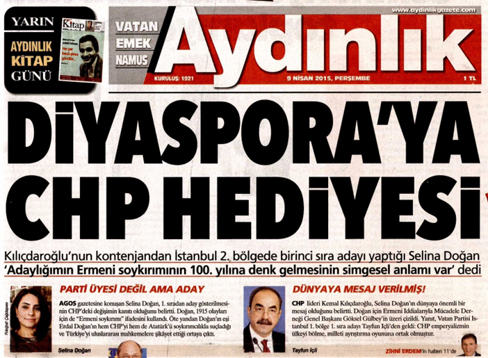 Öte yandan, Aydınlık Gazetesi de 9 Nisan tarihli nüshasında, Doğan’ın adaylığı için ‘CHP’den Diasporaya 100. yıl hediyesi’ manşeti attı. Haberde “ABD ve AB sözde Ermeni Soykırımının 100. yılı için anma hazırlıklarını sürdürürken CHP de boş durmadı. CHP, Kurtuluş Savaşını ve Türkiye Cumhuriyeti’ni soykırımcı ilan eden Erdal Doğan’ın eşini kontenjandan İstanbul 2. Bölgeden 1. Sıra adayı yaptı” ifadeleri geçiyor.