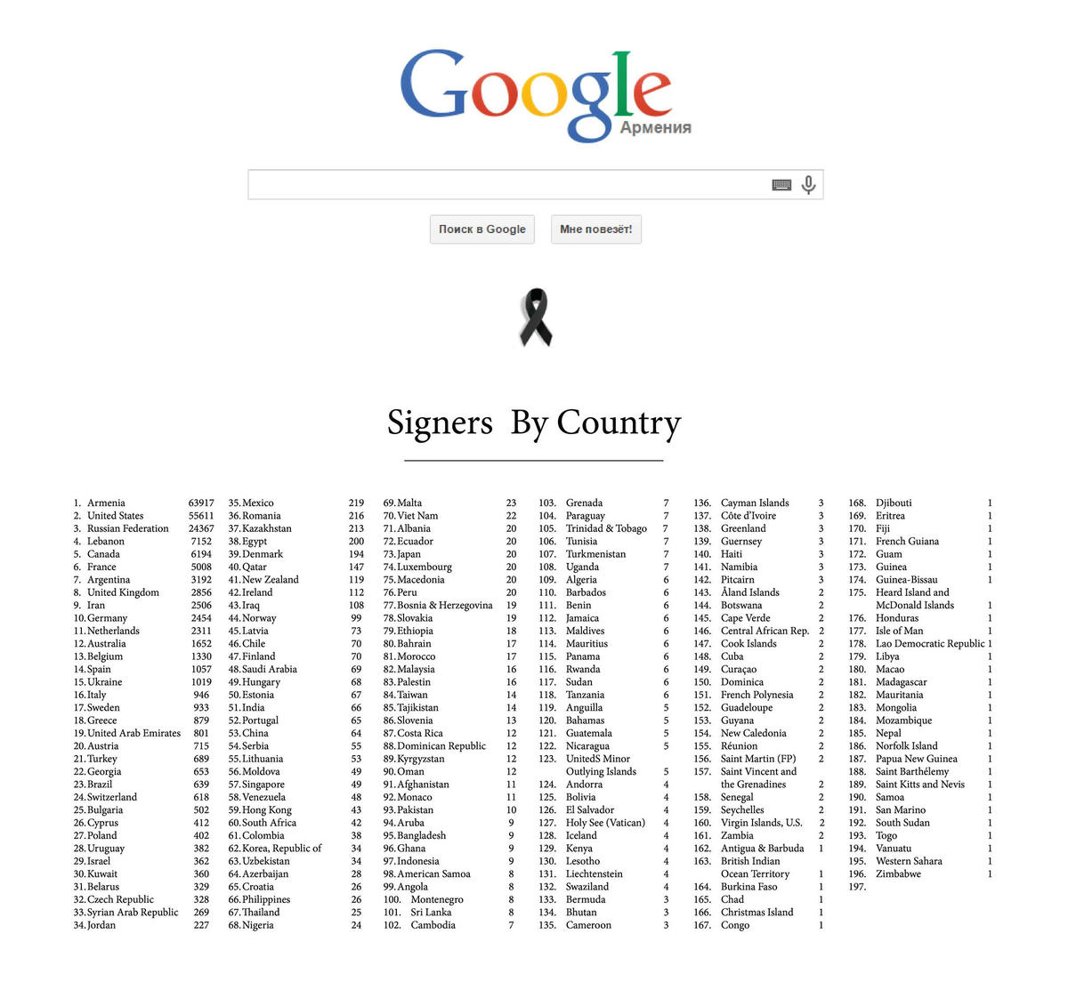 Google ise sadece Ermenistan uzantılı sitesinde soykırımı andı. Siyah bir kurdele kullanan Google, doodle kampanyasına imza veren 200 bin kişinin de yaşadığı ülkelere göre listesini verdi. Kampanyaya imza veren 196 ülke bulunuyor.