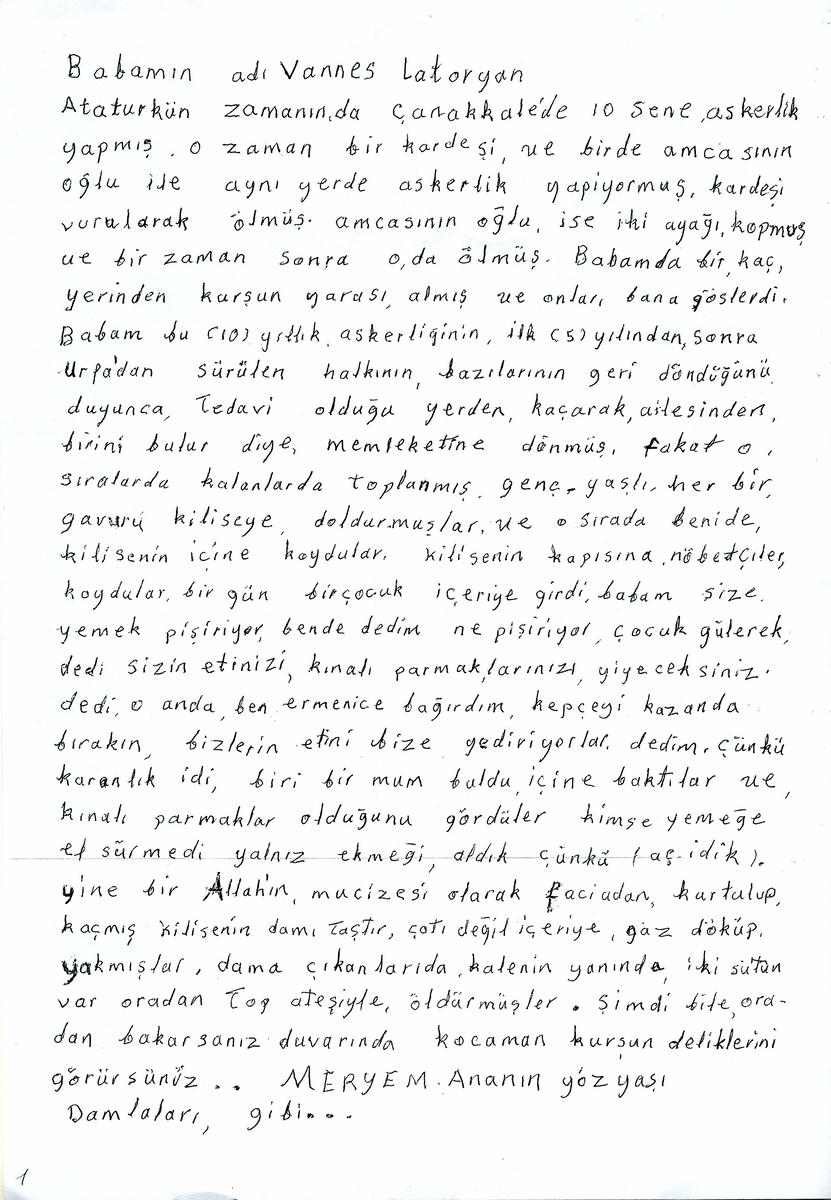 "1915'te ben 10 yaşlarındaydım. Bir sabah damda otururken, baktım uzaktan bir karaltı yaklaşıyor. İnsanlar balta, kürek, kazma, orak, arık ne bulmuşlarsa alıp Ermenileri öldürmek için yola çıkmışlar. Dedenizle beni çobanlık, rençberlik yapalım diye öldürmediler. Muşlu bir adam vardı. "Sizin yaşayıp yaşamayacağınız belli değil. Ama kız kardeşinizi bana eş olarak verirseniz, o yaşamaya devam eder" demişti. Ablam, çok güzeldi. Sarışın, renkli gözlü. Abim, onun kurtulması için adamın isteğini kabul etti... 1930'larda başlayan isyan döneminde, askerler tarlaları evleri yakıyorlardı. Ne yemek, ne ekmek, hiçbir şey yok. Hastalıklar, kıtlık başladı. Kalktım Muş'taki bacımın yanına gittim. 'Askerler abimizi öldürdüler. İki öksüz yavruya ben bakıyorum; ama ne ekmek, ne yemek, çocuklara verebileceğim hiçbir şey yok. Böyle giderse, çocuklarla birlikte açlıktan öleceğiz. Belki buraya gelsek, hayatımız kurtulur’ dedim. Ablam, ‘Ermeni olduğunuz için sizi burada yaşatmazlar. Ama din değiştirirseniz, belki o zaman bir şey yapmazlar’ dedi. Ona, ‘Ailemizden geriye sadece biz üçümüz kaldık.Yaşarsak, Ermeni olarak yaşarız. Yaşayamazsak da Ermeni olarak ölürüz’ dedim. Köyümüze geri döndüm. Yeri geldi, değirmenden un çalıp suda haşlayıp babangilin karnını doyurabildim. Yeri geldi, aç susuz dağlarda saklanarak yaşadık, ama Ermeni olarak yaşamaya devam ettik."