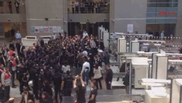 Polis, adliyenin içinde açıklama yapmak isteyen avukatları kalkanlarla darp ederek dışarı çıkardı. Arbede sırasında bazı avukatlar ezilme tehlikesi geçirdi.