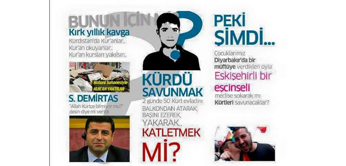 İmzasız dağıtılan broşürlerde yer alan ifadeler şu yönde: “Kürdü savunmak, 2 günde 50 Kürt evladını balkondan atarak, başını ezerek, yakarak katletmek mi?”, “Kobani bahanesiyle Kur’an yaktılar: Kürdistan’da Kur’anlar... Kur’an okuyanlar... Kur’an kursları yakılsın... S. Demirtaş ‘Allah Kürtçe bilmiyor mu?’ desin diye mi verildi?”, “Çocuklarımız Diyarbakır’da müftüye verdikleri oyla Eskişehirli bir eşcinseli meclise sokarak mı Kürtleri savunacaklar?”