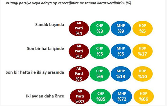 Bu seçimler öncesi yapılan hemen hemen tüm anketlerde kararsızların oranı son haftaya kadar oldukça yüksek düzeyde seyretti. IPSOS’un seçim sonrası araştırmasına göre de her 100 kişiden 6’sı son hafta, 5’i ise sandık başında kararını verdi. Bu oran HDP’de diğerlerine göre oldukça yüksek.
