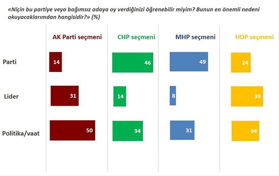 Yine 7 Haziran’ın en ilginç sonuçlarından birisi de seçmenin oy verdiği partiyi tercih sebebinde ortaya çıkıyor. Burada özellikle AK Parti’deki değişim ilginç. Önceki seçimlerde lider nedeniyle oy verenlerin oranı ezici bir çoğunluk oluştururken, bu seçimde pran bir hayli düşük. Lider karizması ise Selahattin Demirtaş’a geçmiş görünüyor. MHP ve CHP’de ise lider oldukça geri düzeyde.