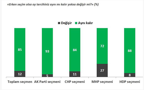 Araştırma sonuçlarına göre olası bir erken seçimde oyunu değiştirmeyi düşünenlerin oranı en fazla MHP’de bulunuyor. MHP’ye oy verenlerin yüzde 27’si erken seçimde tercihinin değişeceğini ifade ediyor. Bu oran AK Parti’de yüzde 12, CHP’de yüzde 11.