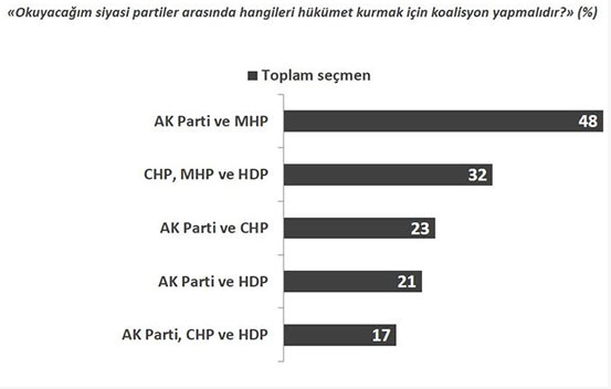 Koalisyon için seçmenin en çok desteklediği partiler Ak Parti ve MHP. Bu iki partinin ardından CHP-HDP-MHP koalisyonu talebi geliyor. AK Parti seçmeninde MHP ile birliktelik ön planda. CHP seçmeni ise Ak Parti dışındaki partilere oldulça sıcak. HDP’de AK Parti ile koalisyon isteyenlerin oranı yüzde 58. CHP ve MHP ile koalisyona ise destek yüzde 47 ile yine dikkat çekici.
