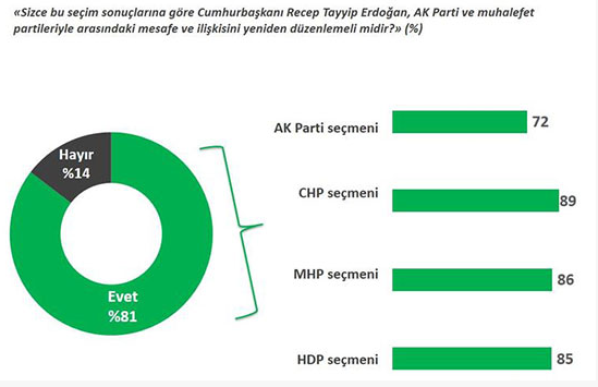 AK Parti seçmeninin yüzde 72’si bile Cumhurbaşkanı Erdoğan’ın muhalefet ile ilişkilerini gözden geçirmesi gerektiğini düşünüyor.