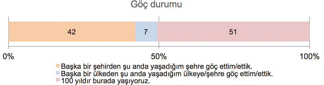 Katılımcıların yüzde 51’i, yaşadıkları şehir veya ülke için ‘100 yıldır burada yaşıyoruz’ diyor. Yüzde 42’si ise şu anda yaşadıkları şehre sonradan göç ettiklerini söylüyor.