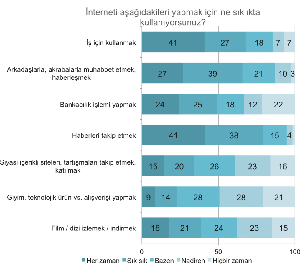 İnternet kullanım alışkanlıklarına bakıldığında 4 önemli başlık ön plana çıkıyor. Katılımcıların yüzde 79’u haberleri takip etmek için interneti kullanırken, yüzde 68’i iş için, yüzde 66’sı arkadaşlarla/akrabalarla sohbet etmek ve haberleşmek, yüzde 49’u ise bankacılık işlemi yapmak için internet başına geçiyor.