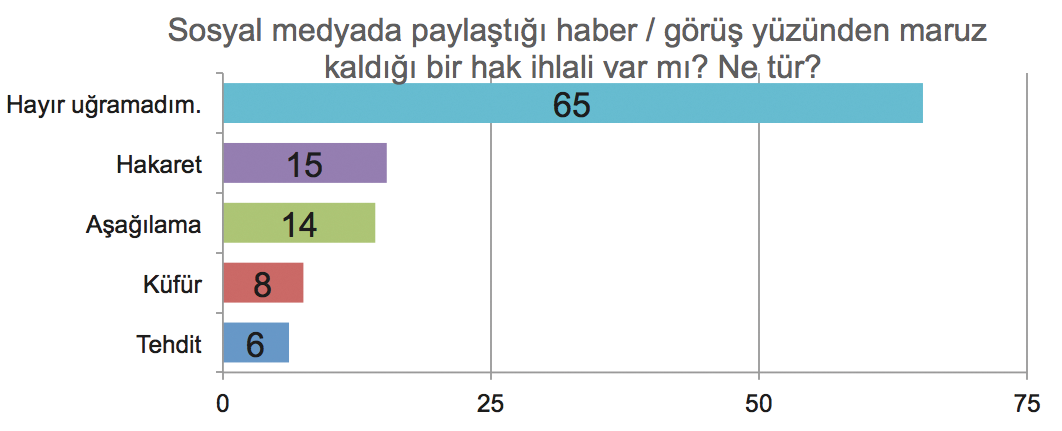 Katılımcıların yüzde 65’i sosyal medyadaki paylaşımları yüzünden hak ihlaline uğramadığını söylerken, yüzde 15’i sosyal medyada hakarete uğradığını söylüyor. KONDA, özgürce görüşlerini ifade edenlerin oranının düşük olmasının, bu oranı da düşürdüğü yorumunu yapıyor.