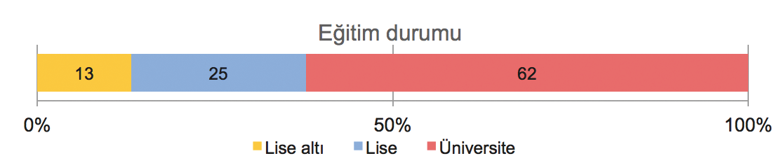 Ankete katılanların yüzde 43’ü kadın, yüzde 57’si erkeklerden oluşurken; yüzde 25’i 14-28 yaş aralığındaki gençlerden, yüzde 37 oranında 29-43 yaş aralığındaki orta yaşlılardan ve yüzde 38 oranındaki 44 yaş ve üzeri orta yaş üstü katılımcılardan oluşuyor. Türkiye ortalamasına çok yakın olan bu verilerin tersine, katılımcıların eğitim durumu ortalamanın çok üzerinde. Katılımcıların yüzde 13’ünün lise altı, yüzde 25’inin lise, yüzde 62’sinin de üniversite düzeyinde eğitim aldıkları sonucunu veren bu istatistik, KONDA’ya göre, anketin online yapılmasından kaynaklı.