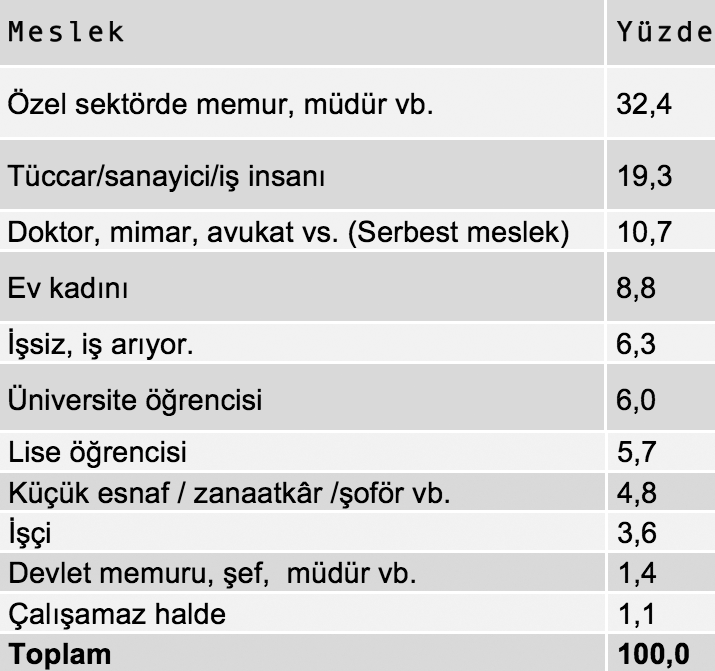 Görüşülen kişilerin üçte biri özel sektörde maaşlı olarak çalışıyor, beşte biri ise ticaret ile ilgileniyor. Onda birlik bir kesim ise doktor, mimar, avukat gibi serbest meslek alanlarında çalışıyor. Katılımcıların yüzde 8,8’i ev kadını, yüzde 6,3’ü ise işsiz. Yüzde 11,7’i öğrenci olan katılımcıların yalnızca yüzde 1,4’ü devlette çalışıyor. Bu katılımcıların çoğunun üniversitede akademik personel olduğu tahmin edilirken, bu istatistik devletin ayrımcı politikalarını açıkça ortaya koyuyor.