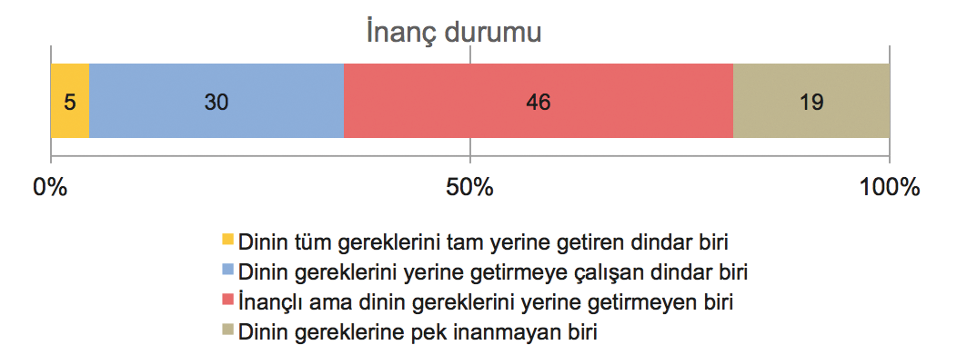 KONDA’nın yaptığı sınıflandırmaya göre, katılımcıların yüzde 5’i kendini çok dindar, yüzde 30’u dindar, yüzde 46’sı inançlı, yüzde 19’u ise inançsız olarak tanımlıyor. Ermenilerin ise yüzde 3,6’sı çok dindar, yüzde 32’si dindar, yüzde 42,6’sı inançlı, yüzde 21,8’i inançsız kategorisine giriyor. Gayrimüslim azınlık toplumlar arasında, kendilerini en çok dindar olarak tanımlayanlarsa Katolik Süryaniler.